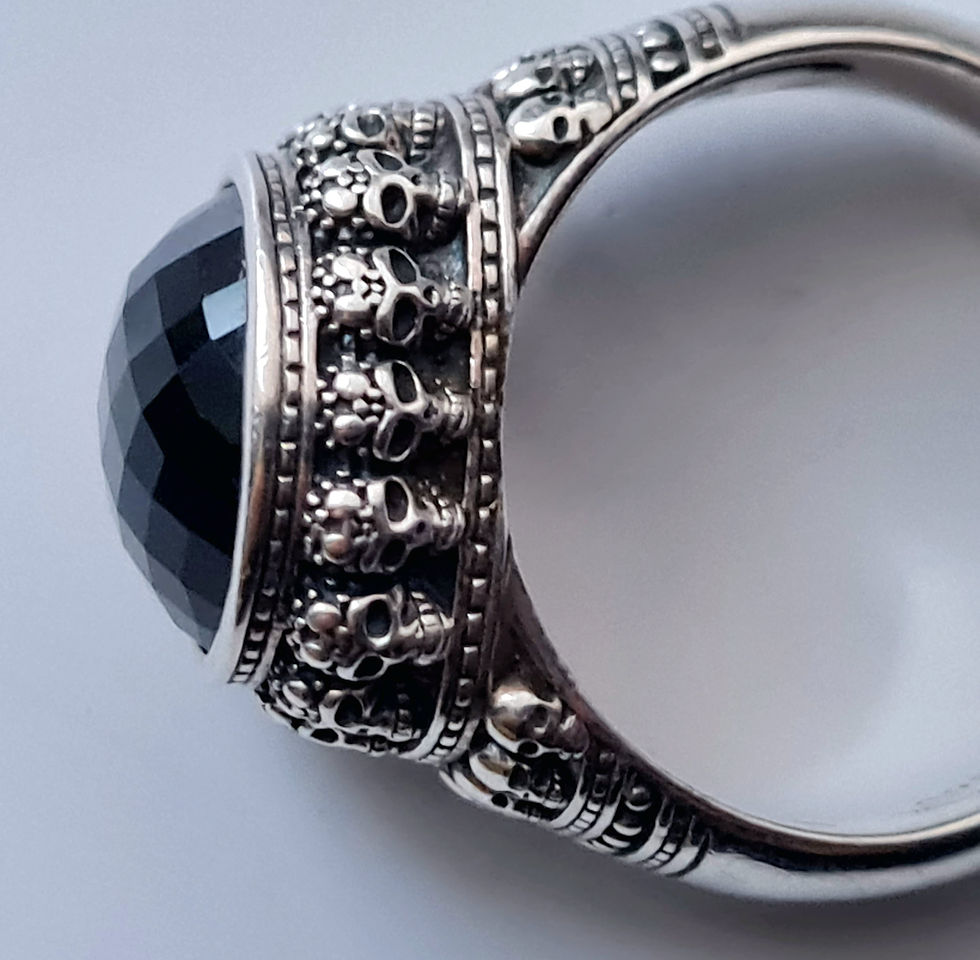 Discover the Thomas Sabo Onyx Skulls Ring at Jefferson Jewellery, a statement ring that is an absolute eye-catcher. Featuring a deep black, mystical-looking onyx at its center, this large faceted stone is surrounded by two rows of small, intricately crafted skulls and rivets. Each detail is masterfully fashioned from blackened 925 Sterling silver, reflecting exceptional craftsmanship. Perfectly suited for lovers of vintage and unique designs, this ring embodies the distinct style and quality that Jefferson Jewellery proudly offers. Elevate your collection with a piece that combines boldness and artistry in one striking accessory.